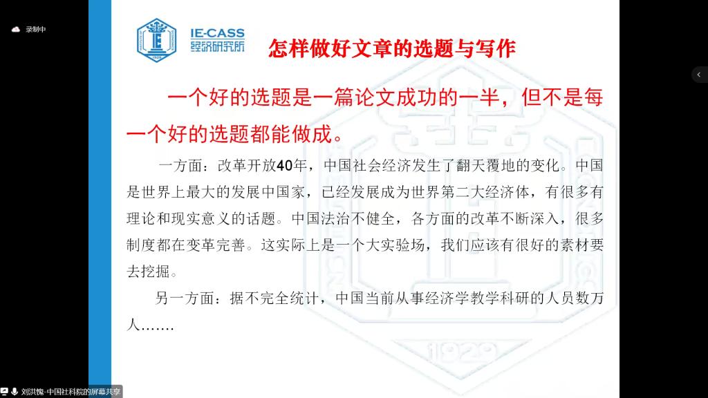 从文章选题、论证以及写作过程的注意事项等方面与环球网页版登录入口师生分享了经济学论文的写作经验。他强调,选题对经济学文章十分重要,好的选题应该具有理论性和思想性,既要有理论上的合理性又能够体现作者的深度思考。刘洪愧副研究员结合自身经验提出了好的选题要从文献中、数据中、现实中来。