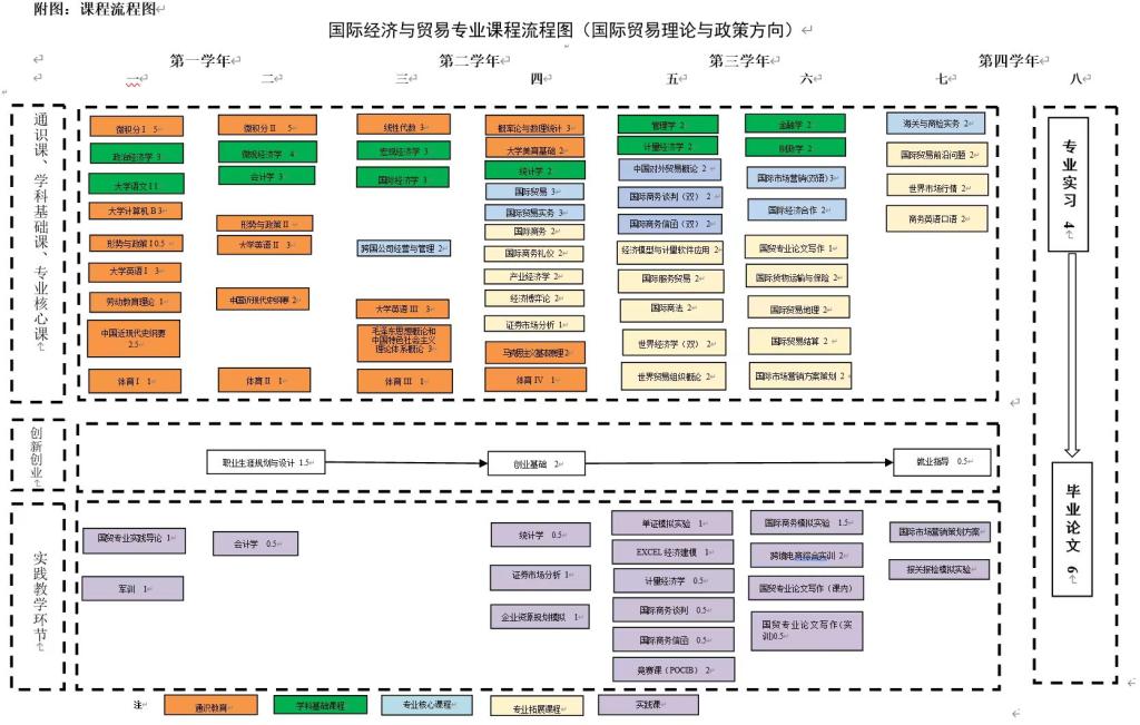 2、实践教学:(1)实验课。包括课内实验和独立设置实验(实训)课程。其中课内实验有海关与商检实务;独立设置的实验课有企业资源规划模拟、单证模拟实验、Python数据分析、经济模型与计量软件应用、跨境电商综合实训、跨境电商大数据、国际商务模拟实验、国贸专业信息检索、证券市场分析9门专业拓展课程以及一门素质拓展课程创新创业基础。(2)专业实习。培养方案包含2周的认知实习和8周的毕业实习,共10周。(3)社会实践。包括两门学科竞赛课程、思政课程实践环节、劳动实践、共128课时+2周。(4)学年论文和毕业论文。学年论文安排在第6学期,毕业论文安排在第8学期,时间分别为2周和8周。学生应遵守学术道德和学术规范,综合运用所学专业知识,在教师的指导下撰写毕业论文。毕业论文指导教师应由讲师及以上职称的专业教师担任,提倡聘请外贸实务部门有关人员共同指导。