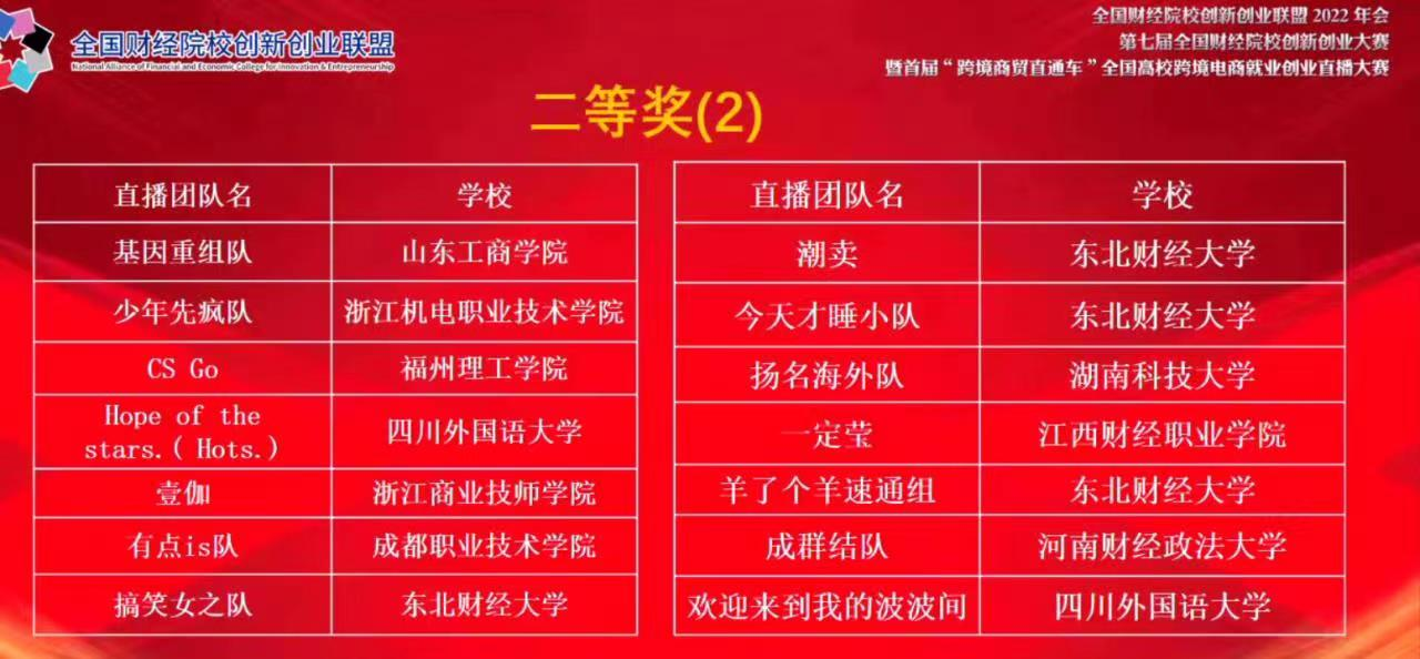 2022年12月11日,由全国普通高校毕业生就业创业指导委员会金融行业就指委指导,全国财经院校创新创业联盟主办,东北财经大学承办,阿里巴巴国际站支持的第七届全国财经院校就业创业大赛暨首届“跨境商贸直通车”全国高校跨境电商就业创业直播大赛正式落下帷幕。在本届赛事上,由环球网页版登录入口国际经济与贸易专业教师姜书竹、王冰心、杨学坤、刘建芳等教师指导的三支队伍分获二、三等奖。其中,何俊霄、张宇琪、王鑫、Wafa等同学组成的“基因重组队”获大赛二等奖,梁楠、潘登、郝钿栋、张亚文等同学组成的“干啥都队”和朱雄辉、李咏、Kobby、易呈祥等同学组成的“Sivan’s star”队分别获得三等奖。姜书竹老师获得优秀主播导师。