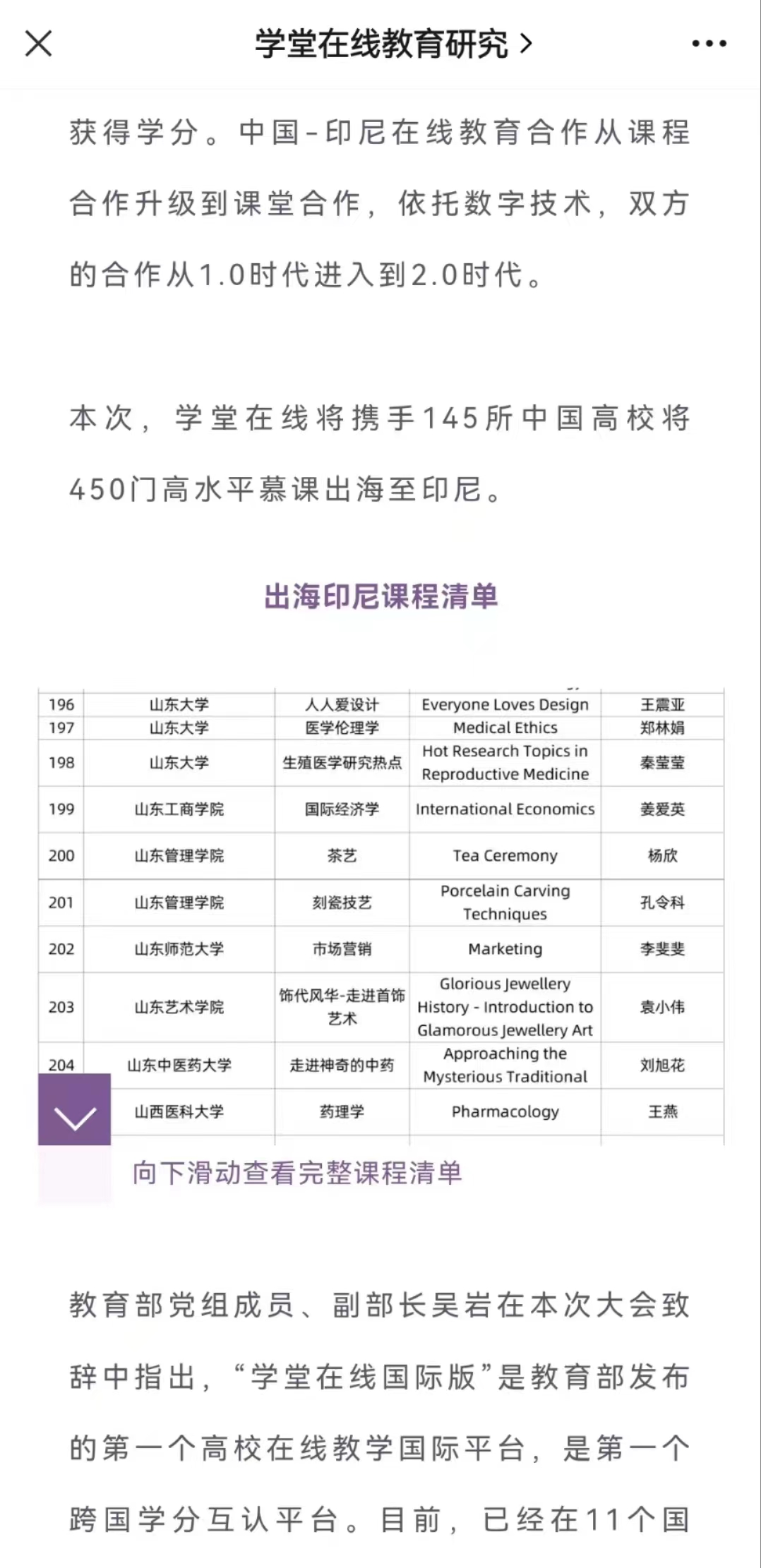 4月23日由清华大学主办的第六届教育部在线教育研究中心智慧教学研讨会暨教育部在线教育研究中心成立十周年大会在清华大学大礼堂隆重举行。此次大会,学堂在线将携手145所中国高校将450门高水平慕课出海至印尼,我校环球网页版登录入口《国际经济学(双语)》课程入选,是我校唯一一门出海的慕课。