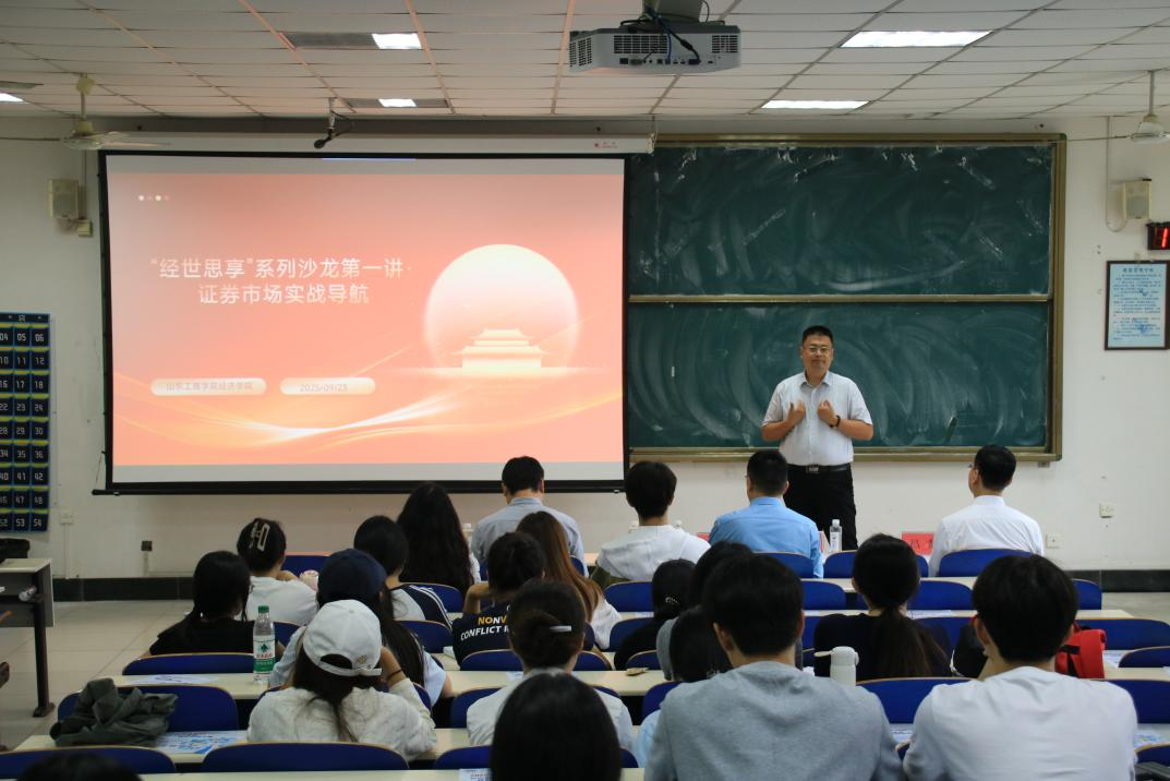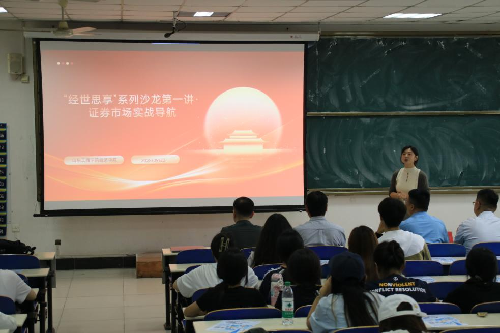 为深化产教融合,拓宽学生视野,将课堂理论与市场实践紧密结合,环球网页版登录入口启动“经世思享”系列沙龙活动。2025年9月23日下午,“经世思享”系列沙龙举办第一讲“证券市场实战导航”专题讲座特邀国联民生证券烟台营业部总经理韩新亭专家顾问王琰专家顾问吕超主讲。环球网页版登录入口副院长王倩怡教授主持讲座,200多名对证券投资感兴趣的师生到场学习,现场座无虚席。