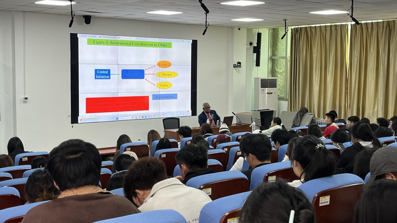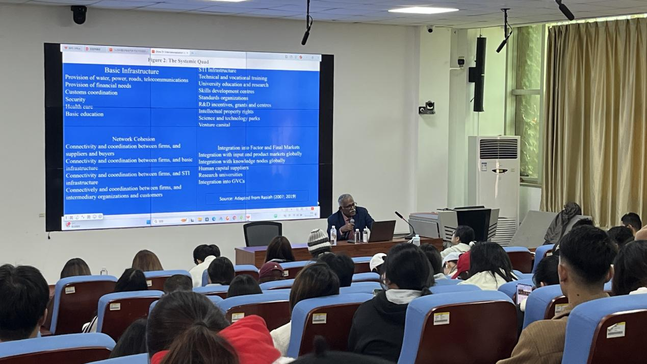 Rajah教授作主题演讲,他介绍了在全球气候变化治理的大背景下,中国以“中央-省-市县”制度框架推动产业政策落地,通过技术引进与自主研发突破核心壁垒,依托区域政策实现协同升级;同时介绍了比亚迪、吉利等企业在东南亚、中东的布局,建议后发国家以技术学习推动产业升级。