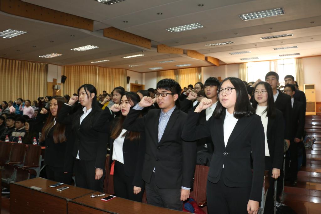 随后是14届主席吴文静发表就职演讲和工作展望,阐述了学生会的职责与义务,并会定期考核,公开结果。同时提出了严以律己,不断创新,共同进步的要求,并带领在场的第14届学生会成员进行宣誓。