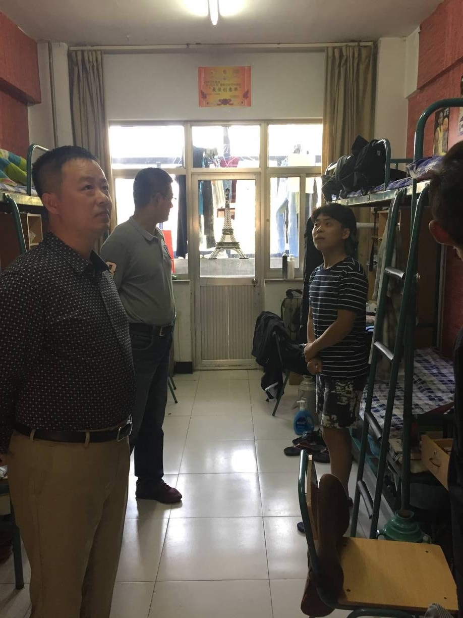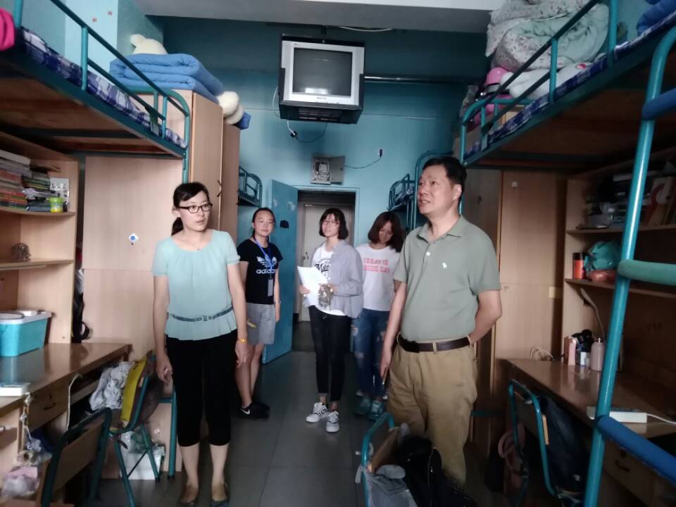 2017年9月30日下午3点,为提高学生安全意识,敦促大家养成良好的卫生习惯,党总支书记马金智,王发明副院长,唐松林副院长,党总支副书记周蕾,团总支书记于向科和17级辅导员赵萌老师,分成四组来到学生寝室,对我院各年级学生寝室进行走访与卫生检查。