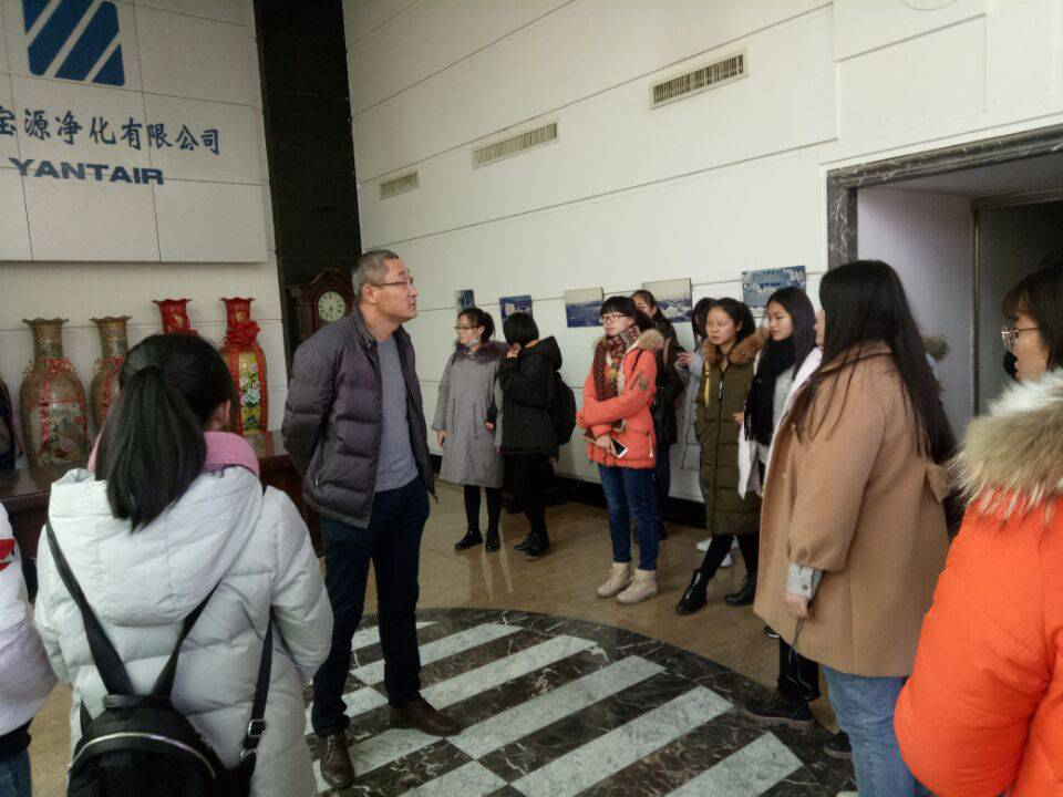 下午两点,同学们步行来到了目的地——烟台宝源净化有限公司。首先由集团工作人员带领同学们进入车间,认识并了解了各种空气过滤器并观看了生产流程及各种成品。最后,同学们来到会议室,宝源集团孟主任给同学们讲解了宝源集团的发展历程并解答了同学们关于企业和就业的问题。