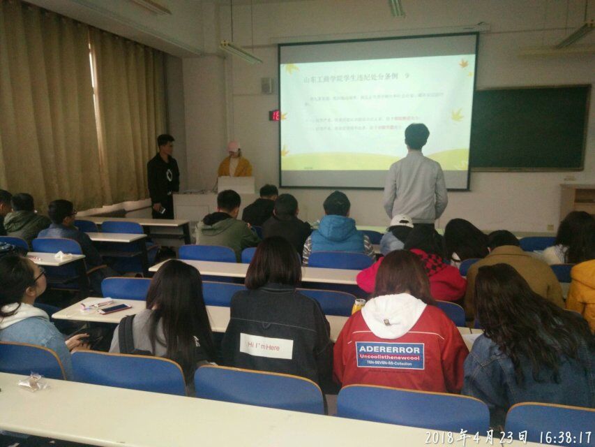 班会开始,班长宣读了一位同学的处分文件,带领同学们学习了山东工商学院学生手册《山东工商学院学生违纪处分条例》,重点学习并宣读其中的部分重要条款。接着,班长带领全班同学观看主题PPT,并为同学进行讲解。最后由团支书发言,强调了此次学风建设的重要性,号召大家放下手机,投入课堂、积极主动,热爱学习。