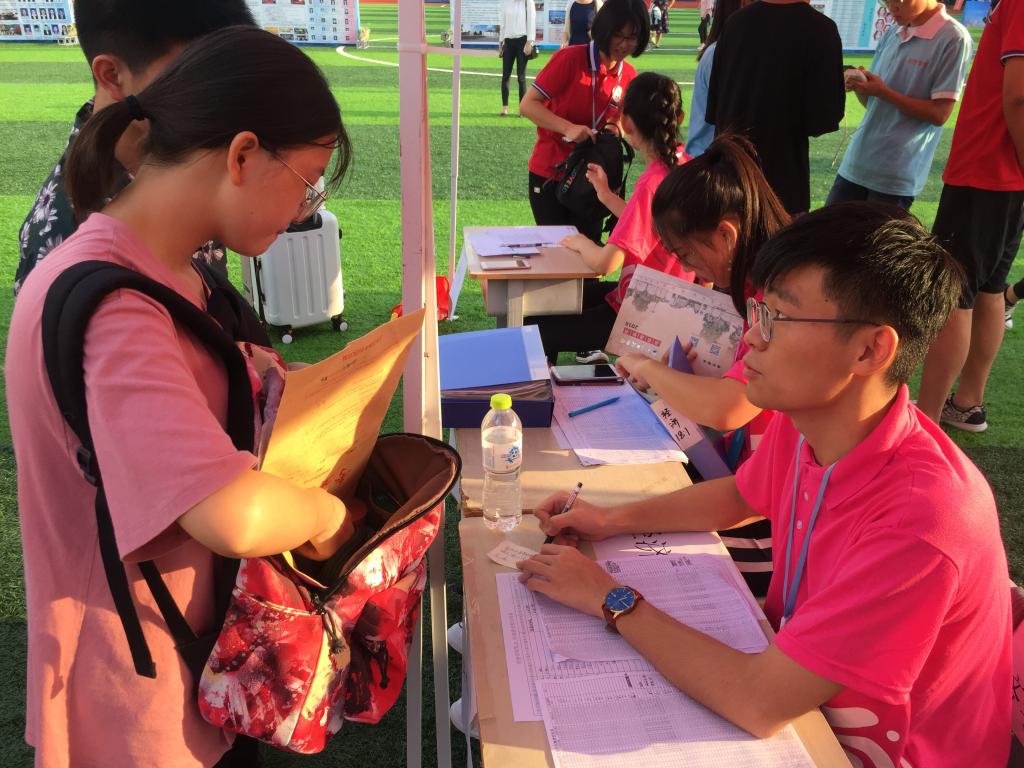 早上六点,所有迎新工作人员到达东校操场,以饱满的热情开始了正式的迎新工作。