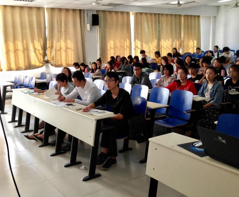 本次汇报会一共有13支队伍参与,每个团队派了两名代表以PPT的形式简要的介绍了他们的参展公司及参展产品的基本情况,并汇报了比赛期间各个环节的完成进度,包括活动布展、产品发布会、全英文模拟谈判的思路和小组分工以及目前的进展情况。
