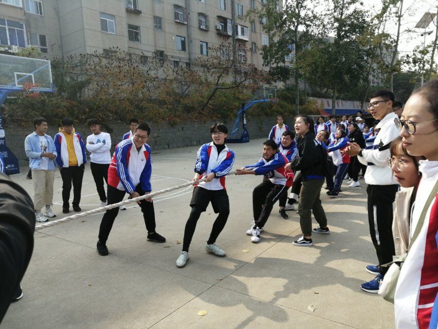 与此同时,拔河比赛决赛也在如火如荼地进行着,随着“一二、一二”的口号,每位同学都全力以赴。比赛的哨声响起,队员们双手紧握长绳,使足了劲一点点往后拉。未上场的同学都在场下为本班同学加油助威。参赛人员本着“友谊第一,比赛第二”的原则进行着比赛,拔河冠军诞生。