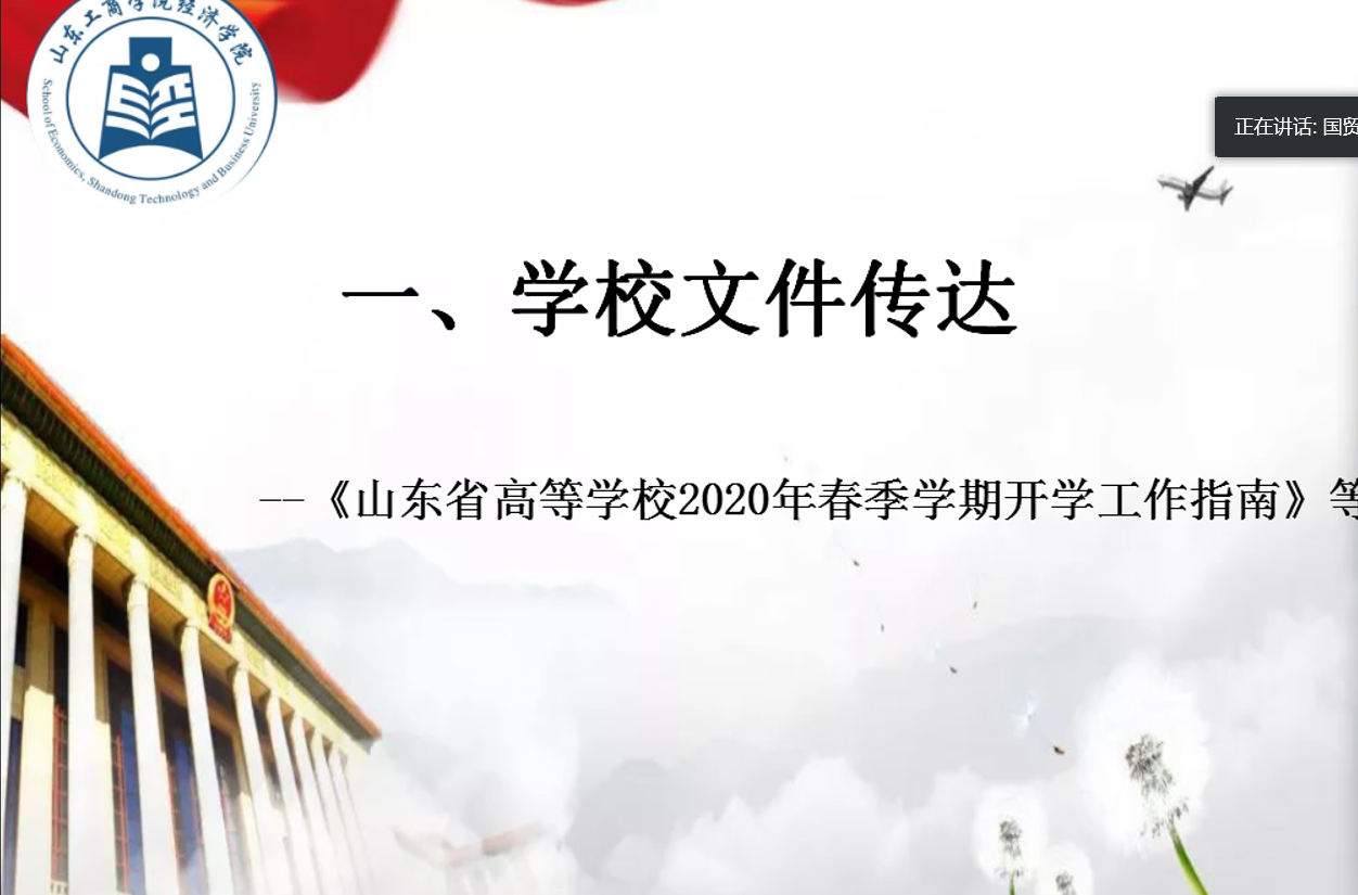会议第一项,主持人传达关于《山东省高等学校2020年春季学期开学工作指南》相关内容,开学条件复杂、严格,需要全体学生干部听从学院安排,进一步统一思想认识、提高政治站位、做好本职工作,全力确保证各项工作顺利有序推进。