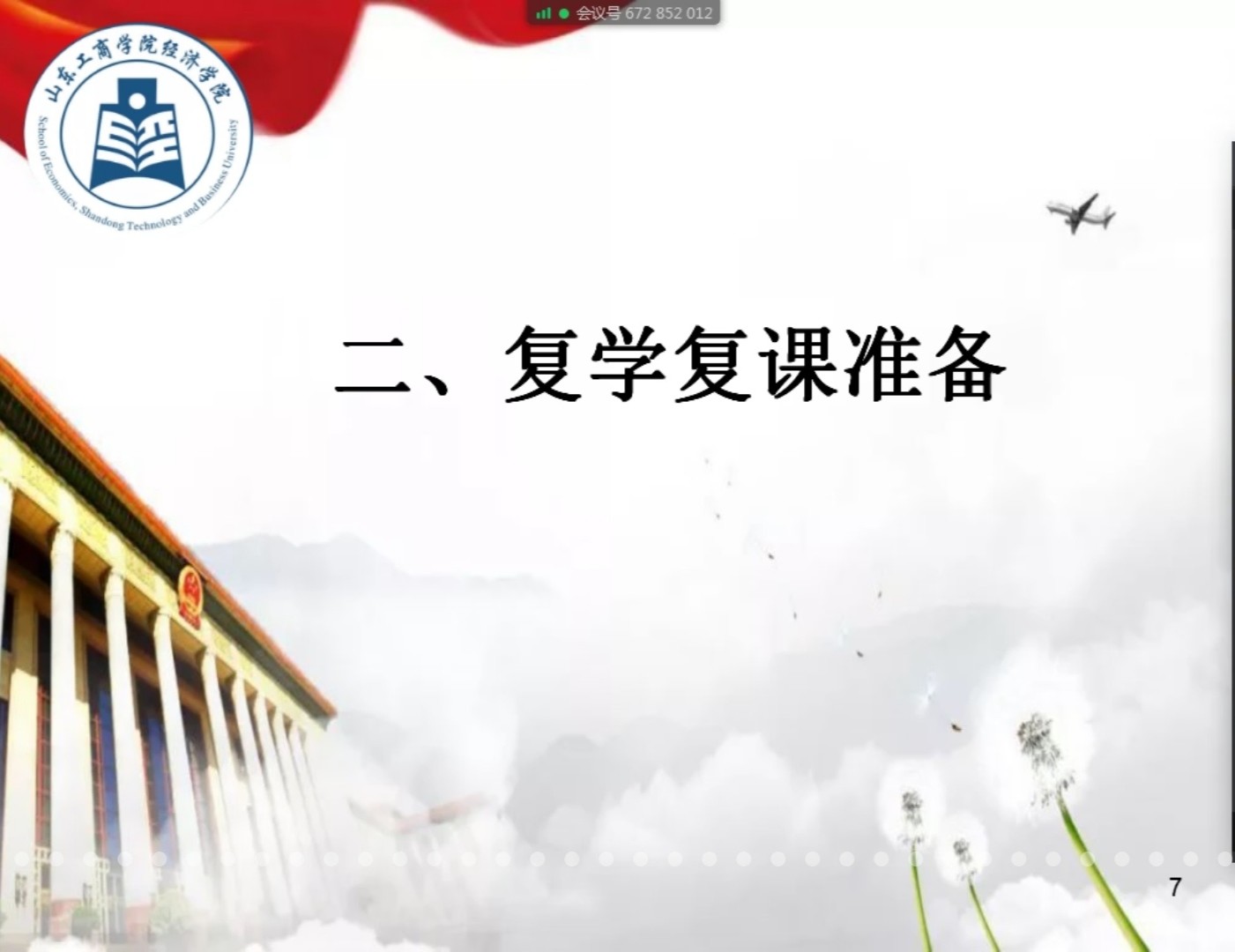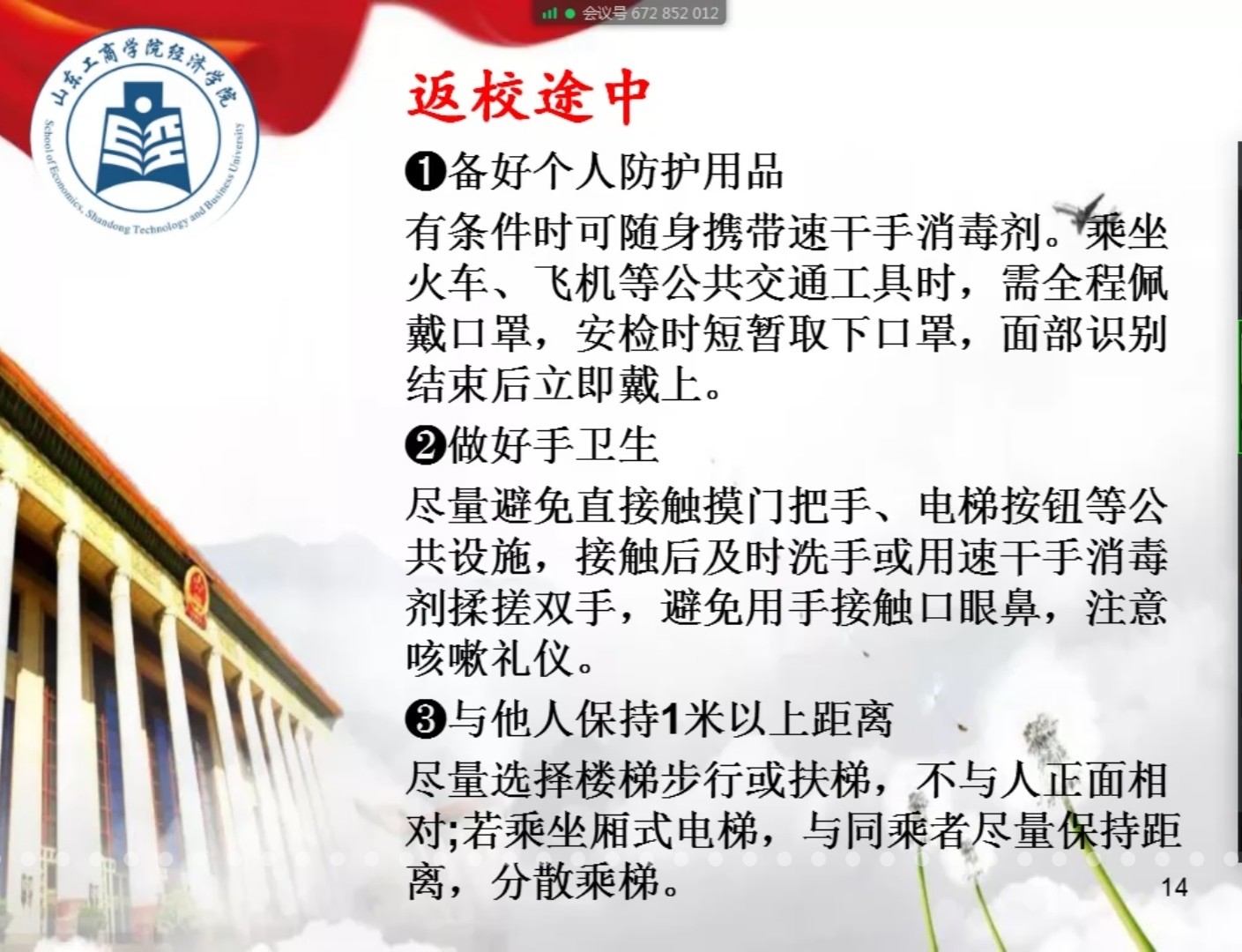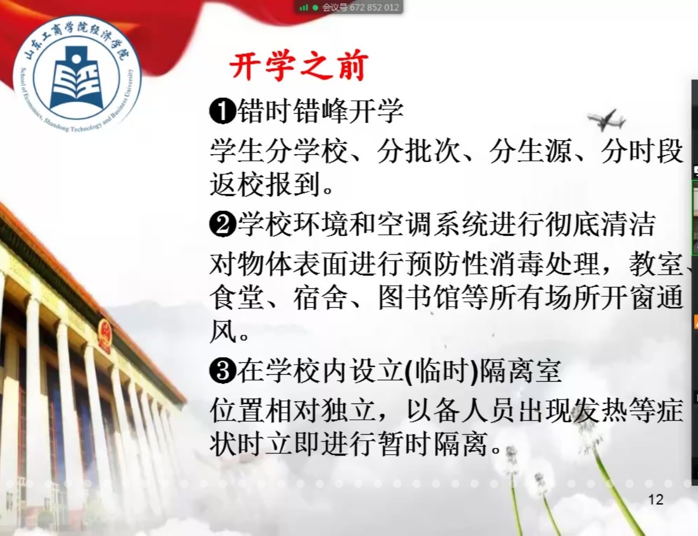 会议第二项——复学复课准备,主持人讲解学校开学准备工作,如错时错峰开学、校园环境设施卫生消毒、宿舍餐厅教室管理、学校应急处置工作等。在返校途中,学生也应做好准备,比如备好个人防护用品、做好个人卫生防护以及与他人保持一米以上距离。最后讲解开学后的8条疫情防控准则,提醒学生干部发挥带头模范作用,遵守学校各项规定。