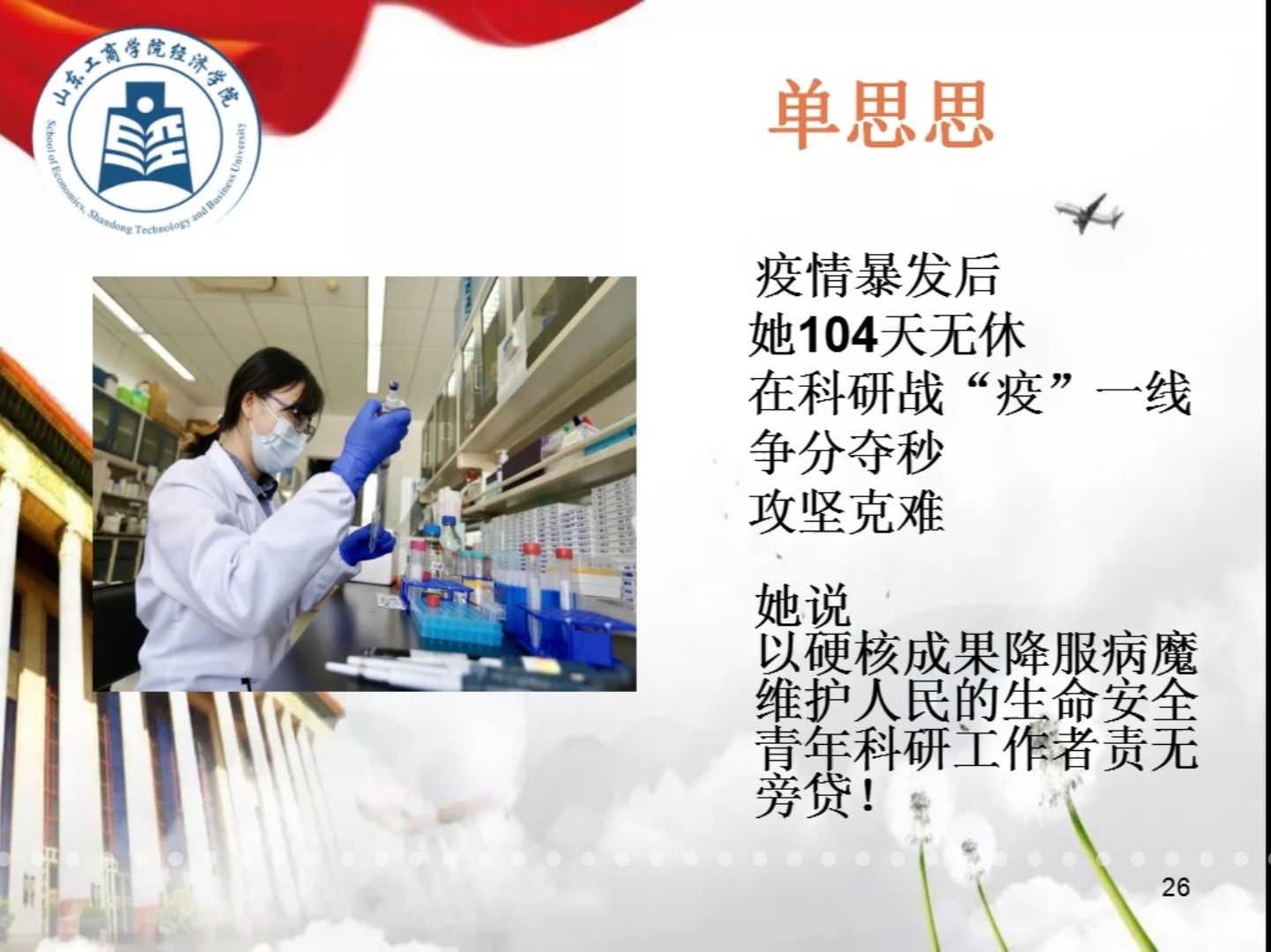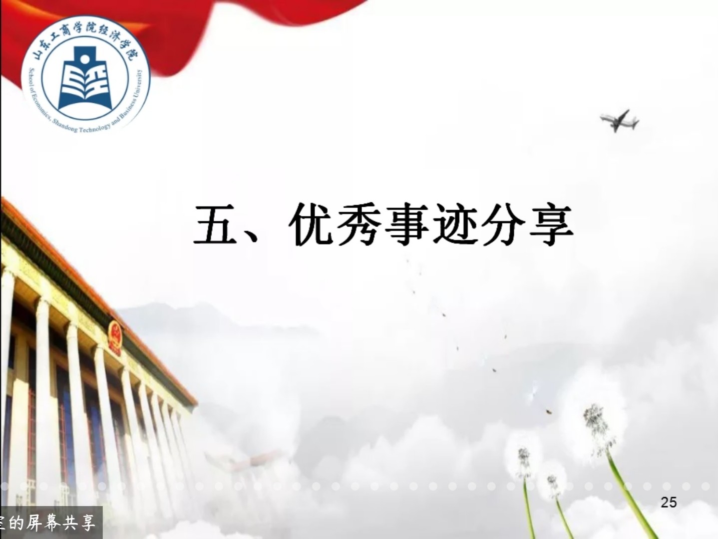 会议第五项,分享疫情期间优秀事迹。清华大学医学生单思思在实验室中不眠不休,最终成功分离出200多株抗新冠病毒的单克隆抗体及其编码基因;济南姑娘王琇琨代表中共青年在联合国组织的会议上,介绍她的战“疫”经验。她们在疫情防控中坚持不懈得拼搏着,用奋斗的青春向祖国深情告白,此刻的我们不仅要发挥作为学生干部的先锋作用,还要用实际行动,为祖国贡献绵薄之力。