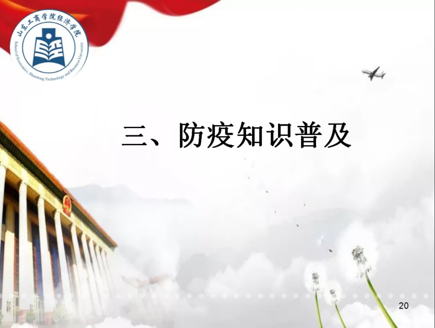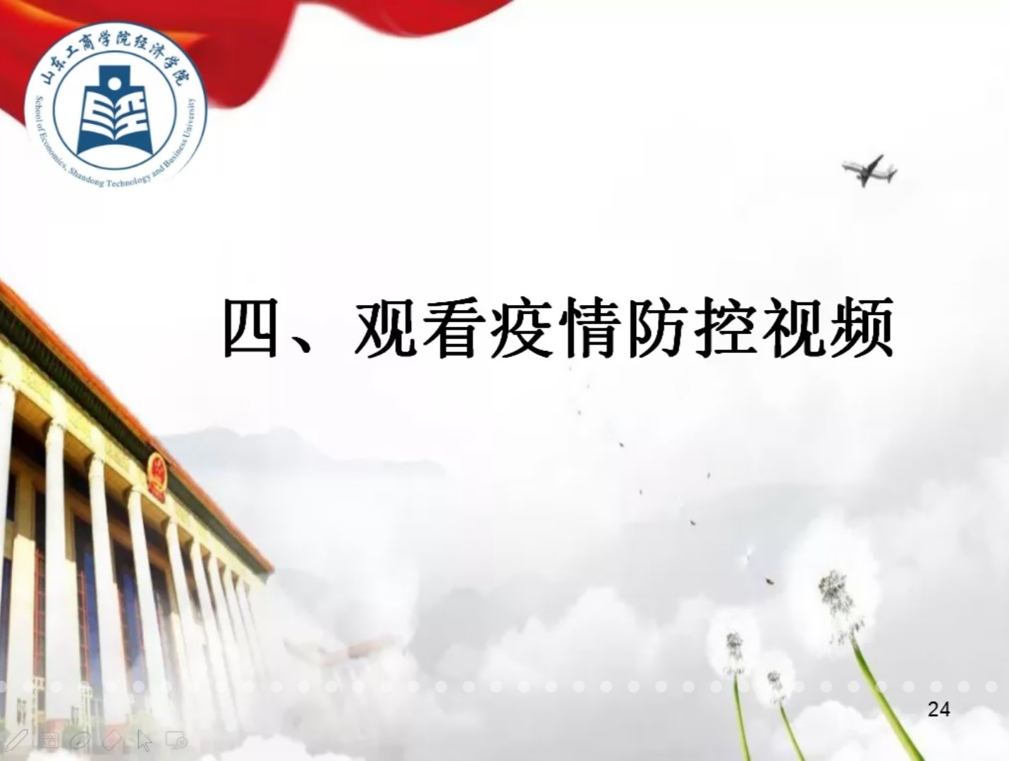 会议第三项,播放新型冠状病毒小视频,普及新型冠状病毒肺炎基本知识,重点介绍七步洗手法及口罩正确佩戴方法,提高同学们防护意识,从我做起。