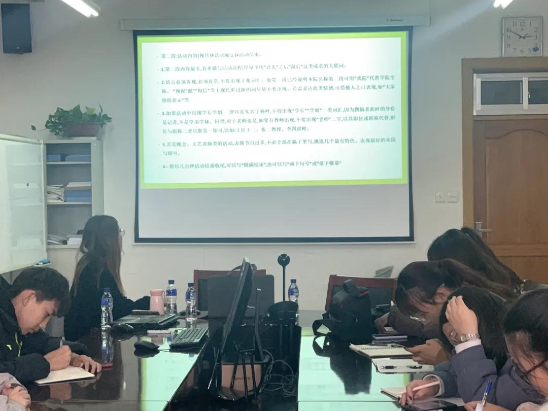 首先由薛皓文同学详细讲解了前期摄影时相机的具体使用方法和后期Pr的使用流程。接着PS小组部长马晓婕具体介绍了PS的具体操作方法。第三位新闻部部长耿辰着重对新闻稿写作的格式和注意点做了详细讲解分析。最后,学生会负责人侯斌及何春晓对本次培训会做会议总结。