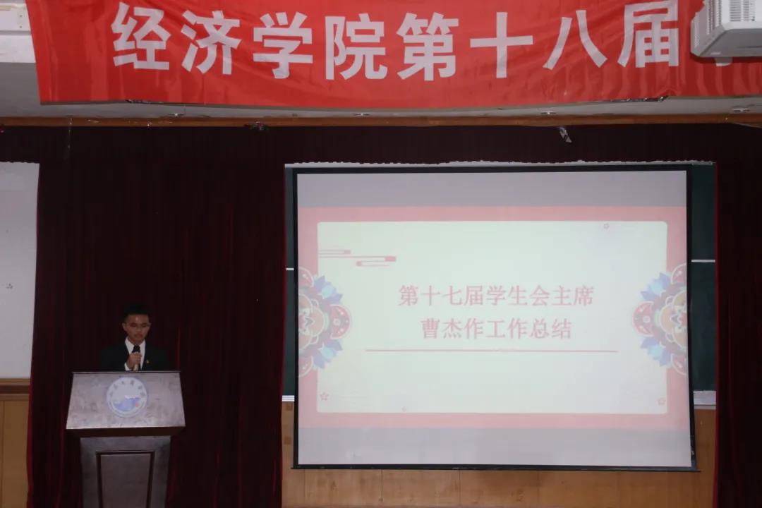 会议第二项:由第十七届学生会主席曹杰做工作总结。他从三个方面对环球网页版登录入口第十七届学生会工作进行总结汇报:首先,践行为学生服务的宗旨,开展注重打造家文化的一系列活动;其次,在加强学风建设、培养实践能力的基础上,开展各种竞赛活动,展现经济学子的风采,培养经济学子的实践能力;最后,提出应进行架构改革、完善考核机制、加强文化建设。